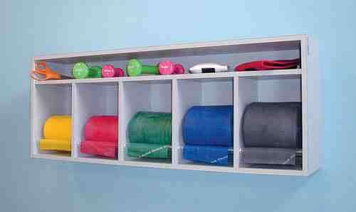 Can store and dispense Thera-Band Rep Band and others (hollow core exercise bands only) * Integrated storage shelves * Refilling is quick and easy * Open design permits visual inspection of inventory * Storage space for scissors or other cutting tools * Can be used on a tabletop or wall mounted (pre-drilled holes; hardware included) Top quality heavy-duty construction Note: Exercise band and other items are not included