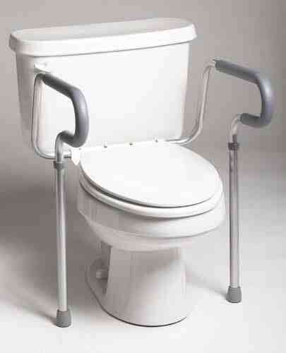 The toilet safety frame offers added security to the toilet while standing or sitting. * The rail attaches directly to the toilet is adjustable from 16 to 18 inches to fit most toilets and is compact for easy storage or travel. * The Toilet Support Rail allows users to safely sit or stand at the toilet. * This rail features Hypalon cushioned hand grips which are comfortable and easy to clean. * Weight Capacity is 300 lbs. *