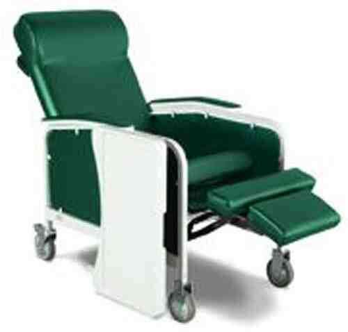 Jade * Ideal for use in dialysis blood collection respiratory and cardiac care * Comfortable 3 position recliner: with an infinitely adjustable back * Deep recline and Trendelenburg position can only be attained by an attendant * Durable fully enclosed side panels are securely attached to protect clothing and skin * Adjustable seat and back straps provide maximum comfort * Large blow molded side trays include recess for cup * 5 casters (2 with locks) make it easy to move and secure the recliner * Standard release handle for quick back release can be operated from either side of the recliner * Neutral colored sturdy steel frame is easy to clean and maintain * Comfortable built-in headrest Foam and vinyl meet CA Flammability Standard and Boston Fire Dept. specs * Available in 3 attractive colors: Blue Ridge Jade and Rosewood * D578 Model features newly designed back support to provide maximum comfort *