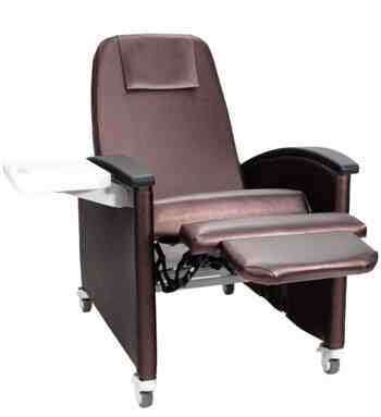 Rosewood * Ideal for use in dialysis blood collection respiratory and cardiac care * Comfortable 3 position recliner: with an infinitely adjustable back * Deep recline and Trendelenburg position can only be attained by an attendant * Durable fully enclosed side panels are securely attached to protect clothing and skin * Adjustable seat and back straps provide maximum comfort * Large blow molded side trays include recess for cup * 5 casters (2 with locks) make it easy to move and secure the recliner * Standard release handle for quick back release can be operated from either side of the recliner * Neutral colored sturdy steel frame is easy to clean and maintain * Comfortable built-in headrest Foam and vinyl meet CA Flammability Standard and Boston Fire Dept. specs * Available in 3 attractive colors: Blue Ridge Jade and Rosewood * D578 Model features newly designed back support to provide maximum comfort *
