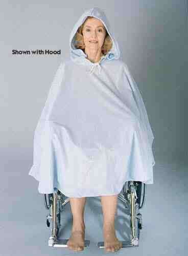 Easy-to-use hooded cape covers resident and wheelchair * Made from durable lightweight waterproof nylon * Universal size fits small to large users * Dries quickly and wipes clean for easy care * Convenient carrying or storage with carrying case