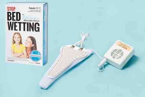 FEMALE ALARM WITH PADS * Compact moisture-sensitive training device for bedwetters * Small plastic alarm box attaches to shoulder area of the bedwetters pajama or t-shirt with velcro attachment close to the ear * Nonabsorbent anatomically designed sensor pad is worn over the genitals and held in place with a pair of snug fitting shorts or panties * Plastic box contains miniaturized electronic alarm and a 9V battery * Alarm box generates a highly alerting warbling sound assuring quicker response to the alarm by the bedwetter * Alarm box has built-in dual-volume control switch for high tone or low tone. Only alarm available with volume control switch * Unique moisture-sensing pad is activated by only 1 or 2 drops of urine. Quickest response among all bedwetting alarms available * Comes with 2 long-lasting reusable moisture sensing pads
