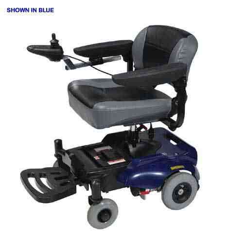 Blue * For indoor and outdoor use * Adjustable height and angle footplate * Breaks down into 4 easy to assemble/disassemble parts * Features free wheel mode where the power chair can be moved manually * Comes standard with anti tippers * Comfortable seat is height adjustable with flip back adjustable width arms * Automatic power shut-down after an undisturbed period of 30 minutes * Easy to remove batteries * Top speed 3.5 mph and a crusing range of 8-10 miles * Has been tested and surpassed the ANSI RESNA testing requirement * VR2 PG controller * No wiring connectors for easier transport * Built in seat belt * Adjustable depth controller arm * 250 lb. Weight Capacity *