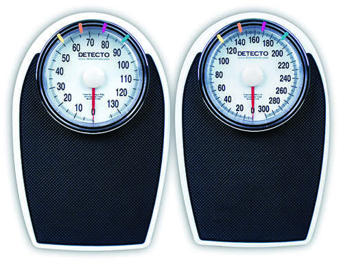 Scale - Pounds / 300 lbs * A low profile design heavy duty construction and a non-skid vinyl mat are just a few features of the Detecto D1130 and D1130K scales - proven performers for budget-minded customers * They feature a white baked-enamel finish and personal colorful indicators to mark one persons or a whole familys weights * The large diameter dial allows for easy readability even for tall people * Designed for personal use fitness centers and health care facilities * Specifications * Capacities: D1130 - 300 lb x 1 lb * D1130K - 140 kg x 500 g * Overall Dimensions: 12 W x 16.75 D x 2.5 H / * Platform Dimensions: 11.25 W x 11.75 D / 286 mm W x 298 mm D * Dial Diameter: 7 / 178 mm * Weight: 9 lb / 4 kg