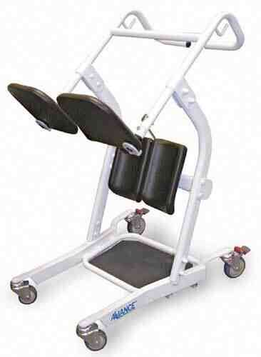 The Alliance Stand Aid is a transport assist unit which keeps residents active and engaged in the lifting process * Requires minimal caregiver assistance * Users simply grasp the middle bar and pull themselves up * A padded split seat swings out for loading or unloading then swings back to form a comfortable secure seat for transport * It is an excellent alternative to a wheelchair * 400 lb (181 kg) safe working load * Dual knee pads for secure transports * Easily fits through narrow doorways * Affordable alternative to electric stand aids * Optional safety belt for user confidence * Note: Alliance Stand Aid is designed for residents who have the strength and stability to lift and support themselves *