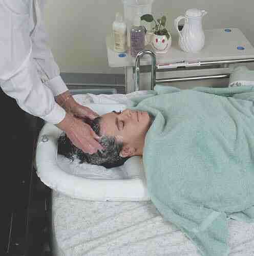 Fits into the space on a bed that is normally occupied by a pillow * At shampoo time the pillow is removed and replaced with the shampoo basin * No repositioning of the person being shampooed is necessary * The basin is inflated by mouth to form a semi-circular ring with a flat side for neck support * A large drain tube is located at the side for easy drainage into a pail * Folds when not in use * Made of white heat-sealed plastic * U.S. Patent #D405 226 * Sized and shaped like a pillow * Makes hair care available to a person in bed *