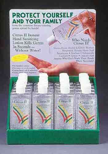 20 Piece Counter Display * Includes 20 of the 4oz bottles * Citrus II Instant Hand Sanitizing Lotion is a moisture-rich gel that kills 99.99% of most common disease-causing germs on the hands in seconds * Citrus II is ideal to use when soap and water hand washing is not available * For extra safety it should be used after hand-washing to kill any remaining germs * Works in 15 seconds * Kills 99.99% of most common disease-causing germs * No water or towels needed * Non-toxic - leaves no harmful residue * Leaves hands soft and refreshed * So gentle repeated use will not dry skin * Fresh clean citrus fragrance *